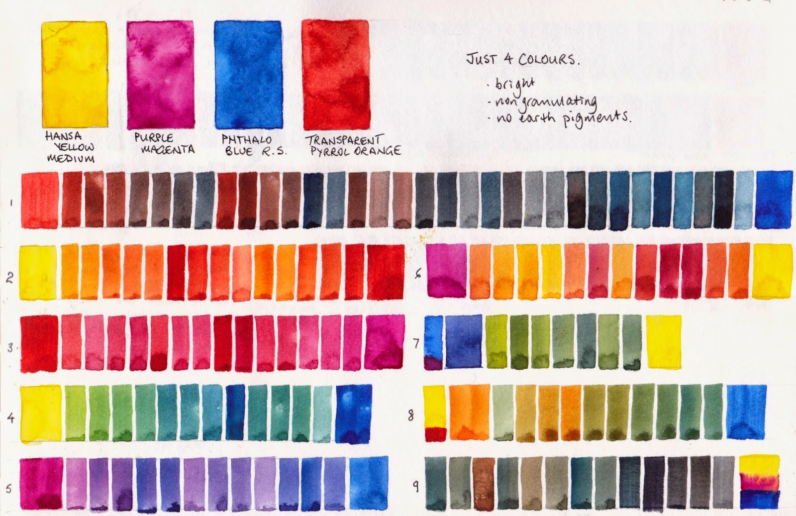 This is the test swatch that Jane has so carefully prepared – taken from her blog – that shows the fantastic range of colours achievable with just four great colours.