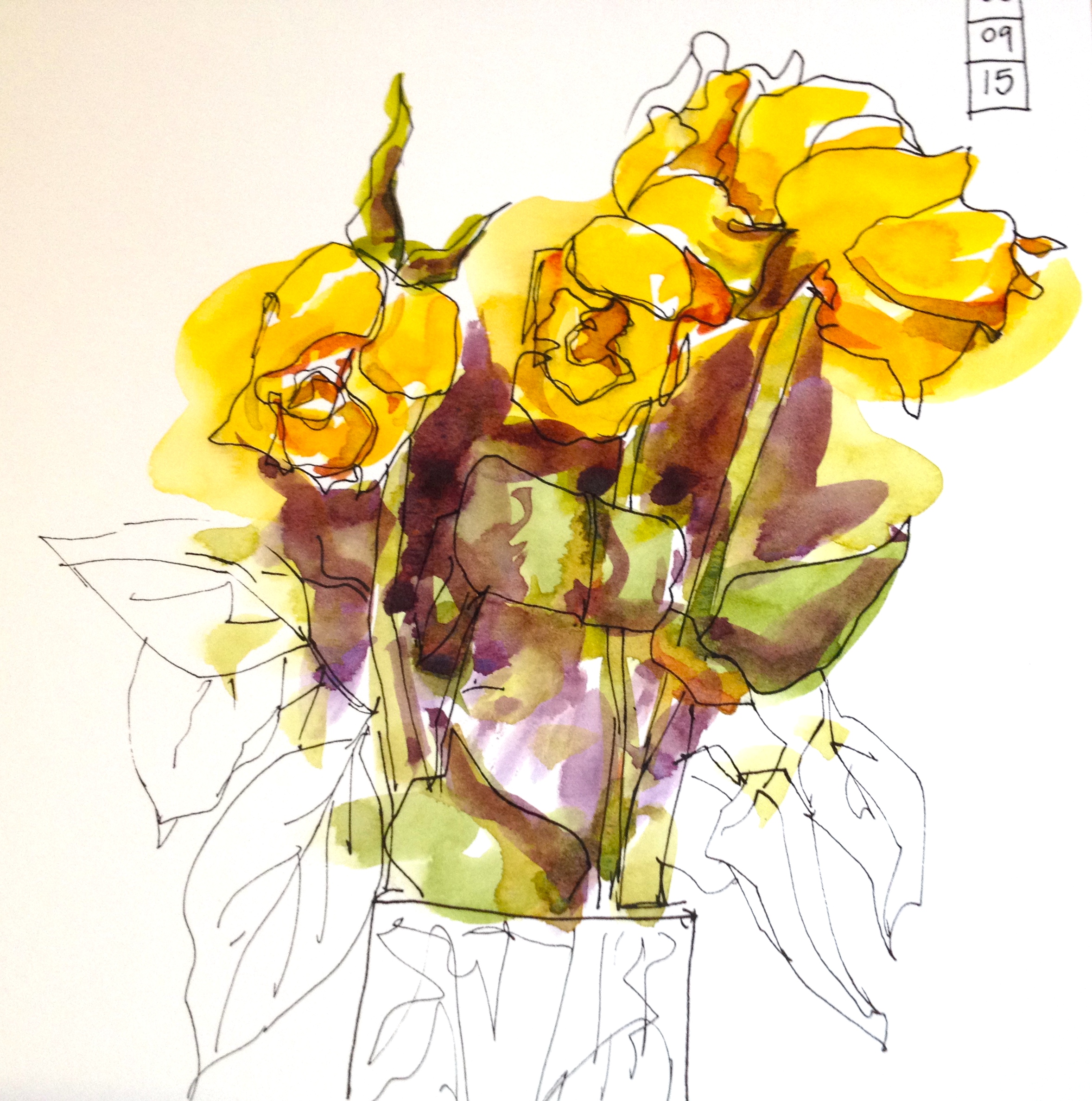 My first two sketches with this palette have turned out really well – I’m loving the colour mixes I’m getting. Figs from the garden at the top of the page, and dead yellow roses…