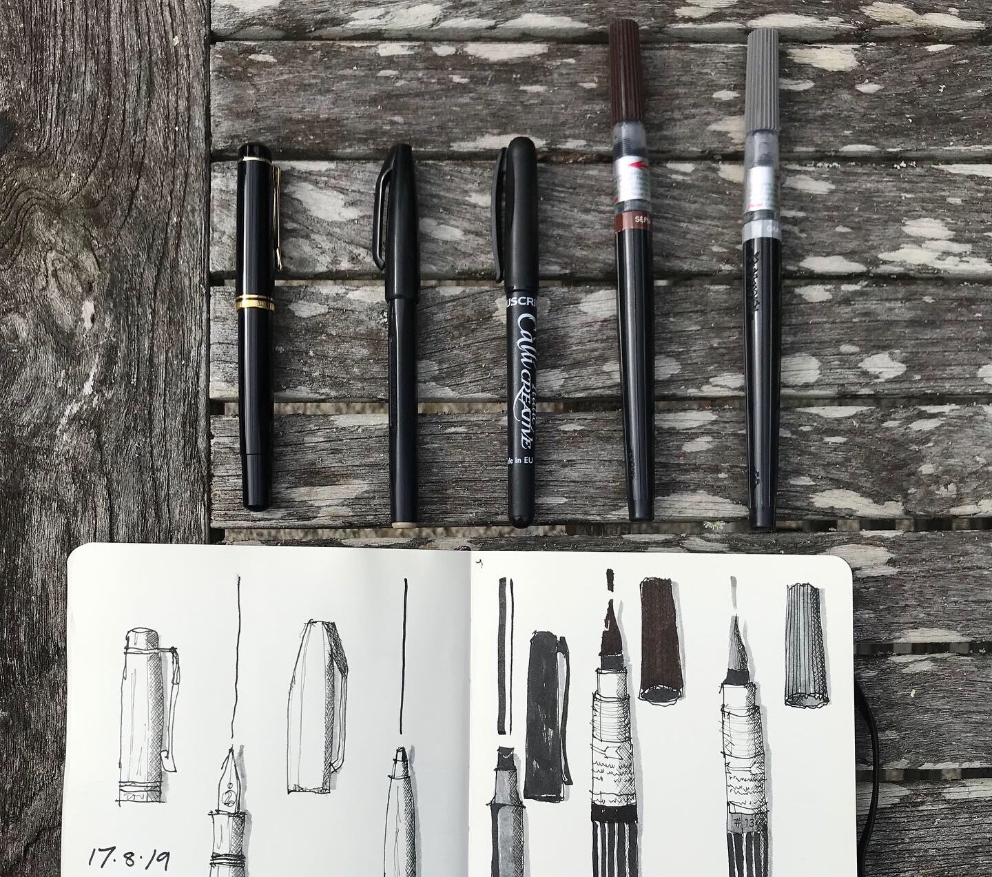 So I’m going back to basics and am avoiding paint. I’m aiming to use just fountain pen (my fave Pelikan M200) with de Atramentis ink, a Pentel sign pen, a thick calligraphy pen, and two Pentel brush pens (sepia and grey).